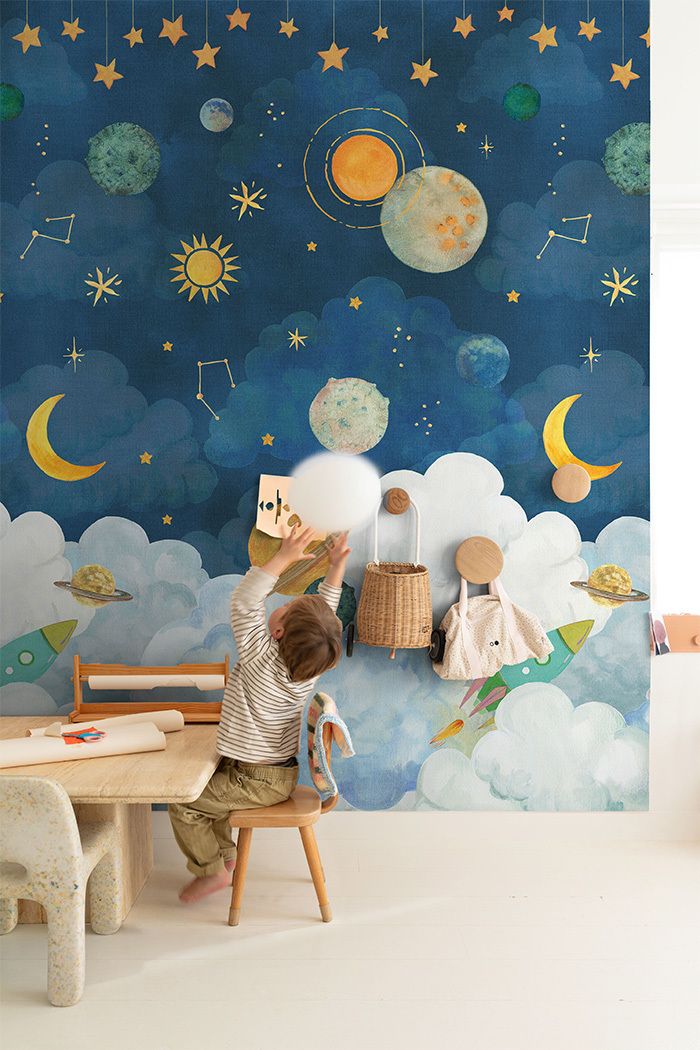 Die Farbgebung kombiniert ein tiefes, beruhigendes Blau mit warmen Akzenten in Gold und Orange sowie sanften Grüntönen. Diese Palette schafft eine inspirierende, gleichzeitig entspannende Atmosphäre – ideal für Kinder, die sich in Weltraum und Abenteuer träumen. Die durchdachte Verteilung der Motive verhindert Überwältigung, während die detailreiche Ausführung zum Entdecken einlädt.